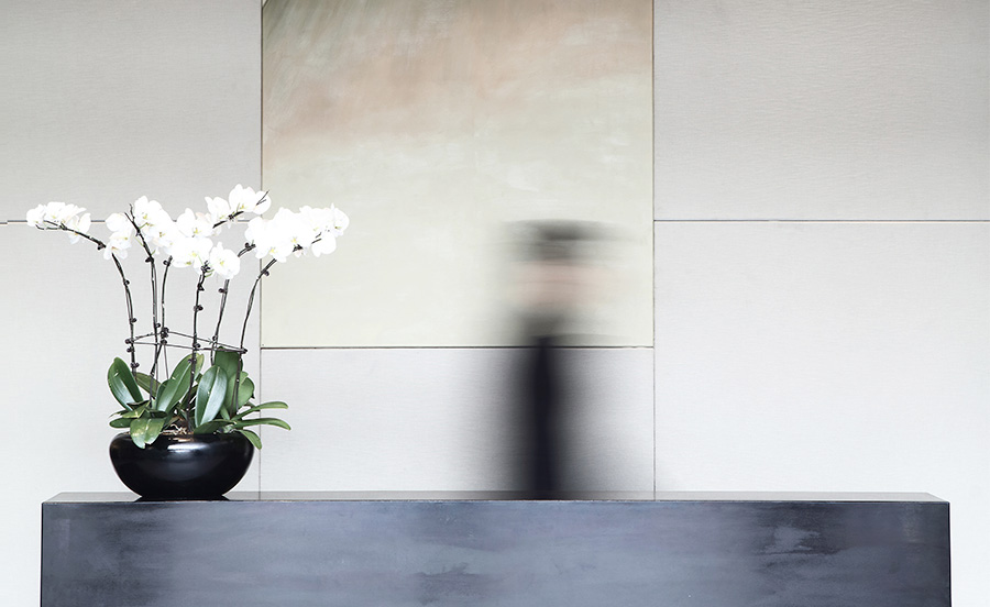迎宾台正中端坐,台上一蔟婷婷如素白兰形同翩翩君子一般伫立,衬在一副同样素面朝天,拔地而起的中式淡彩画墙前,谁能说得清熟是画中物,熟又是画外音?此端景恰似中式建筑空间传统意义上“照壁”的韵味,室内景象在它的遮挡下则若隐若现。