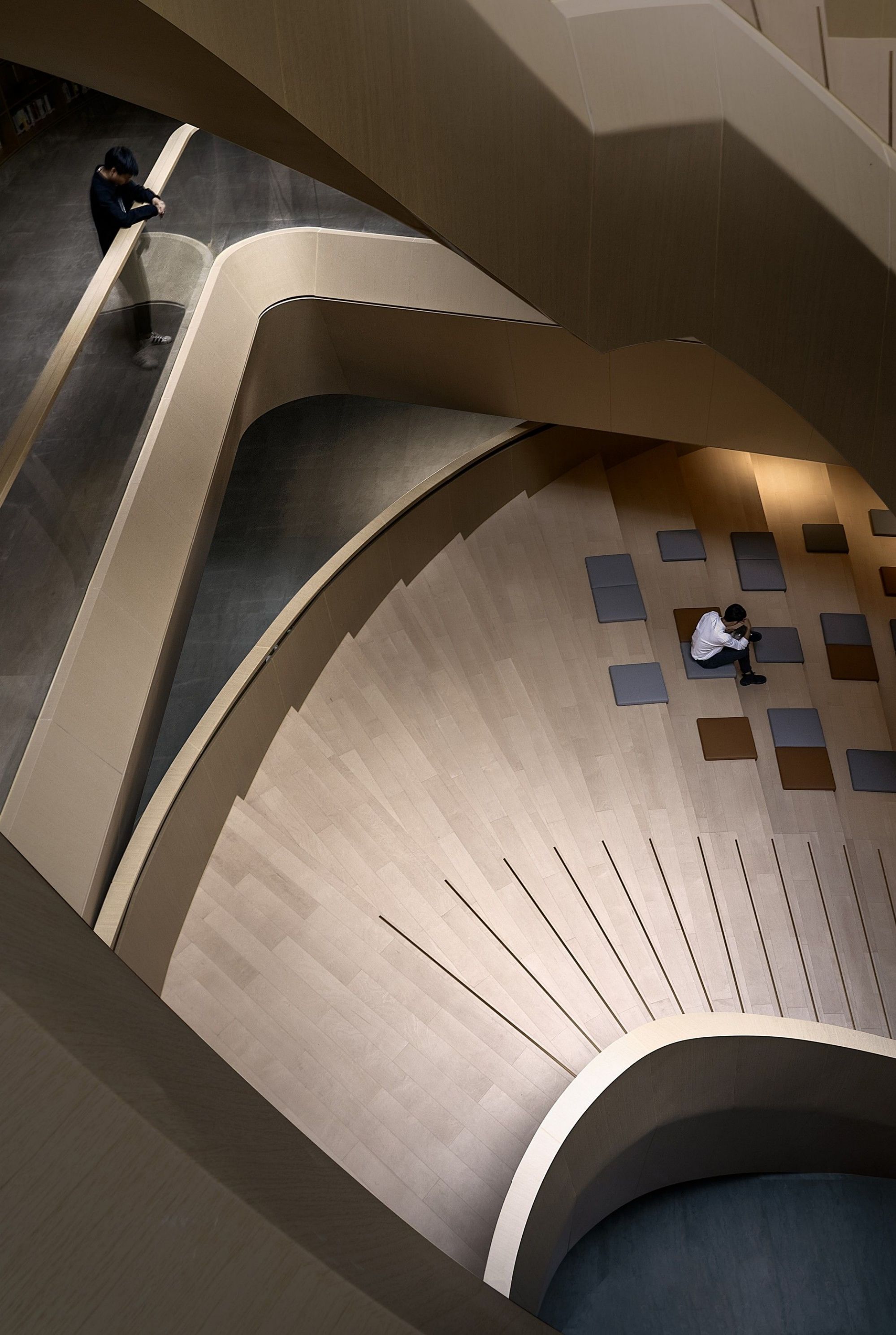 至此楼梯与各层的环形走道相连,走道与“内建构”盒体相连,室内脉络一气呵成。建筑是“东南-西北”多面朝向,通透幕墙环绕;由外而内,功能空间靠窗且面中庭。自然光通过四周幕墙及天窗引入室内,肆意侵略流淌,没放过任何可能的角落,开放式书吧也因此注入了丰厚的质感和近人的温度。